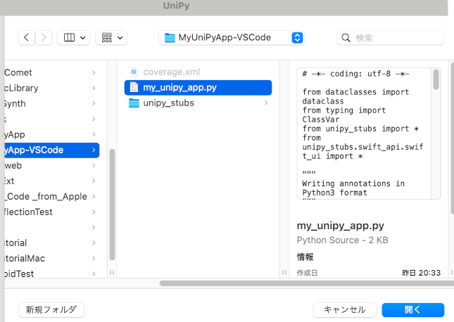上までの行程で作成した「my_unipy_app.py」を選択して開きます。