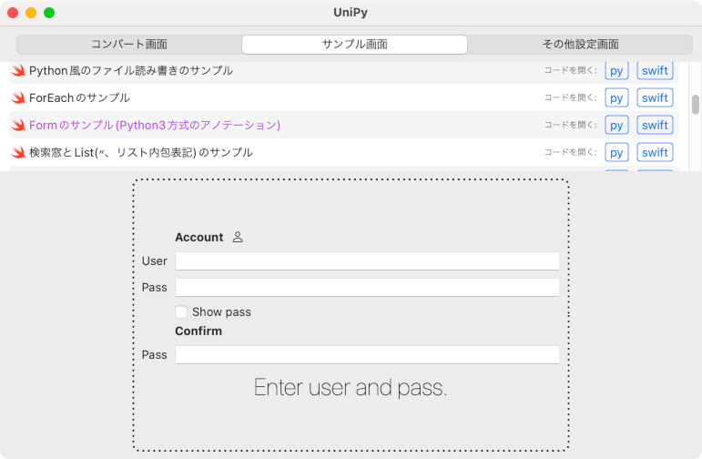 UniPyで変換処理をし最終的にSwiftのコードになるPythonのファイルを作成します。